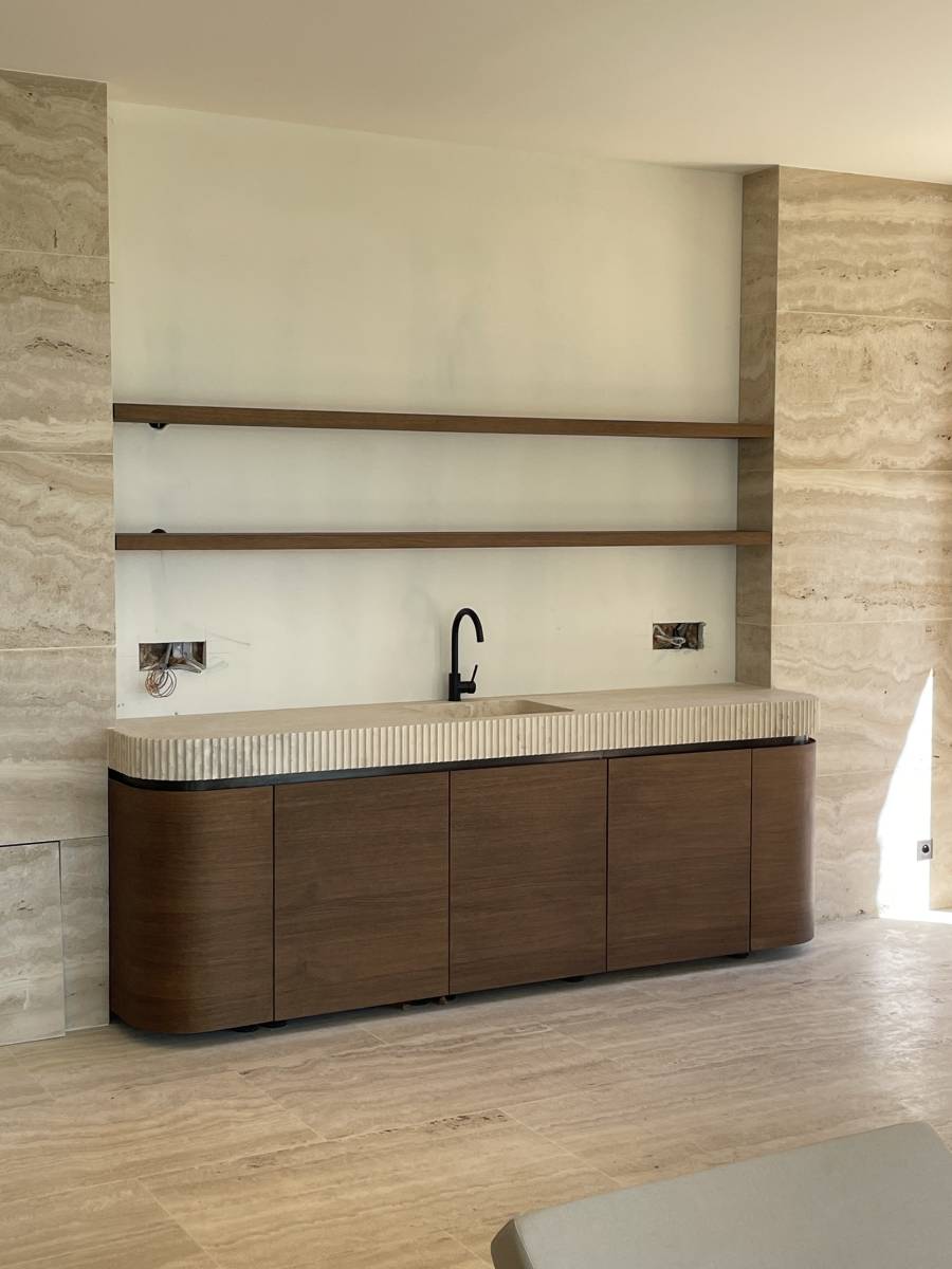 Réalisation sur mesure d'une Tisannerie, façades chêne verni teinté plan travertin.